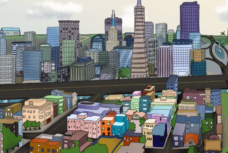 Heavily inspired by San Francisco and Los Angeles; A city full of trolleys, celebrities, tech bros and appareantly occultists, urban legends and wealth disparities :D. It's also the birthplace of City:Chat the local social media app that connects everyone in the city. San Es is broken up into 3 major districts split by a large connected street but has 6 districts in total;